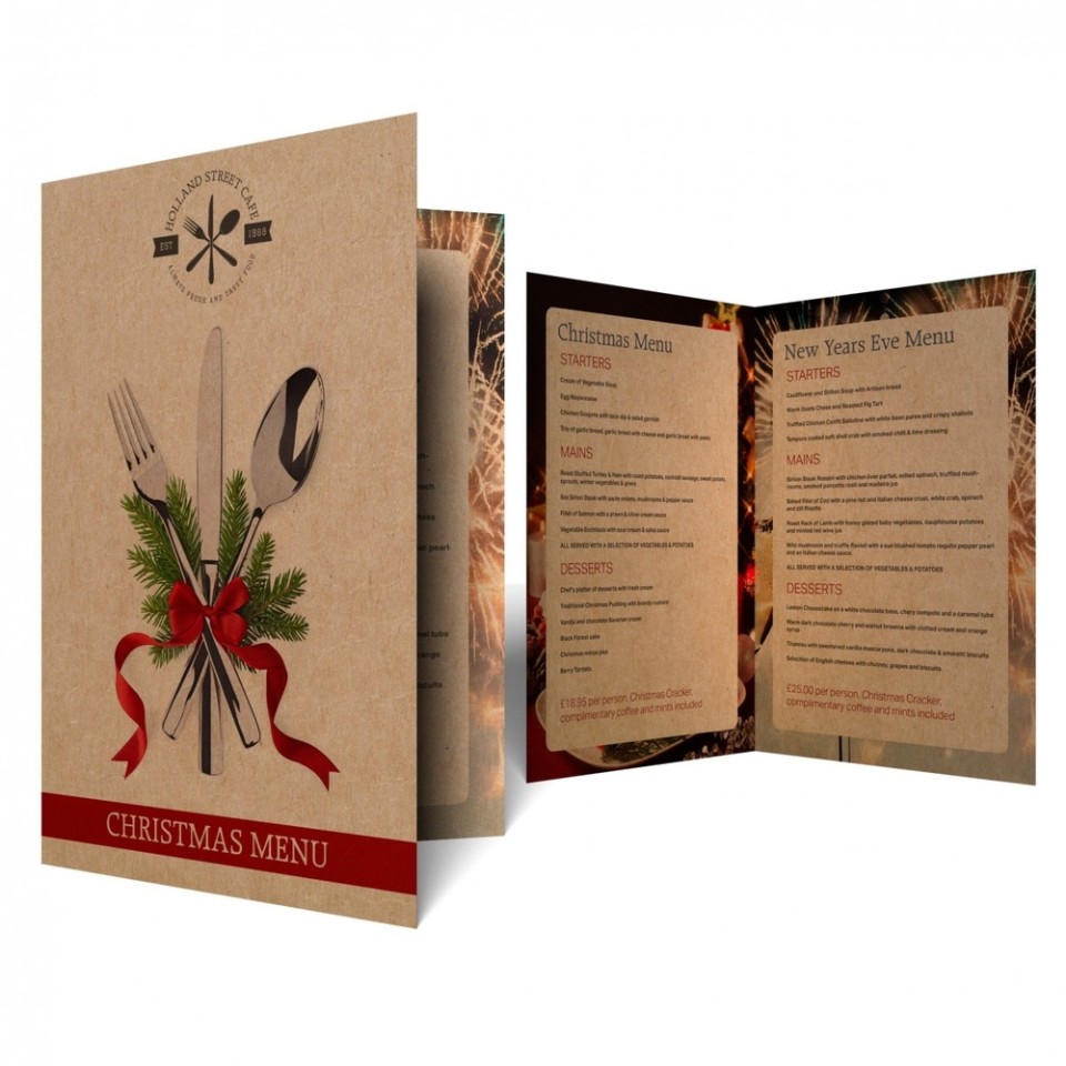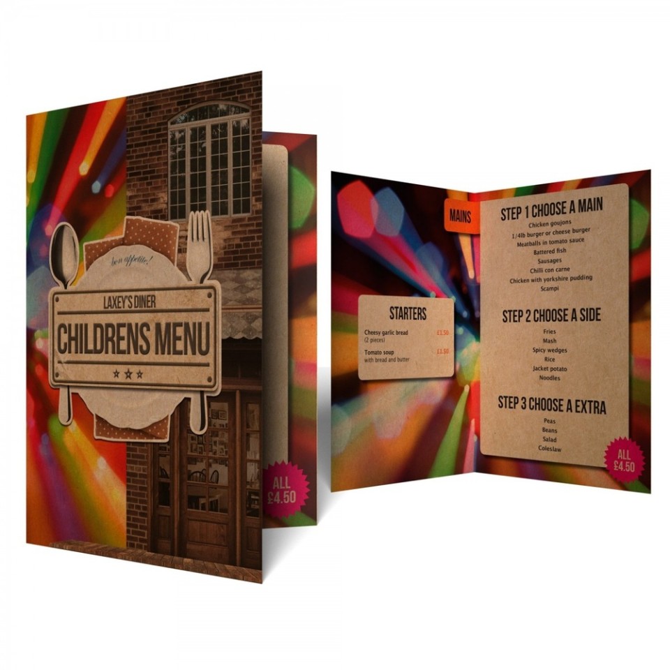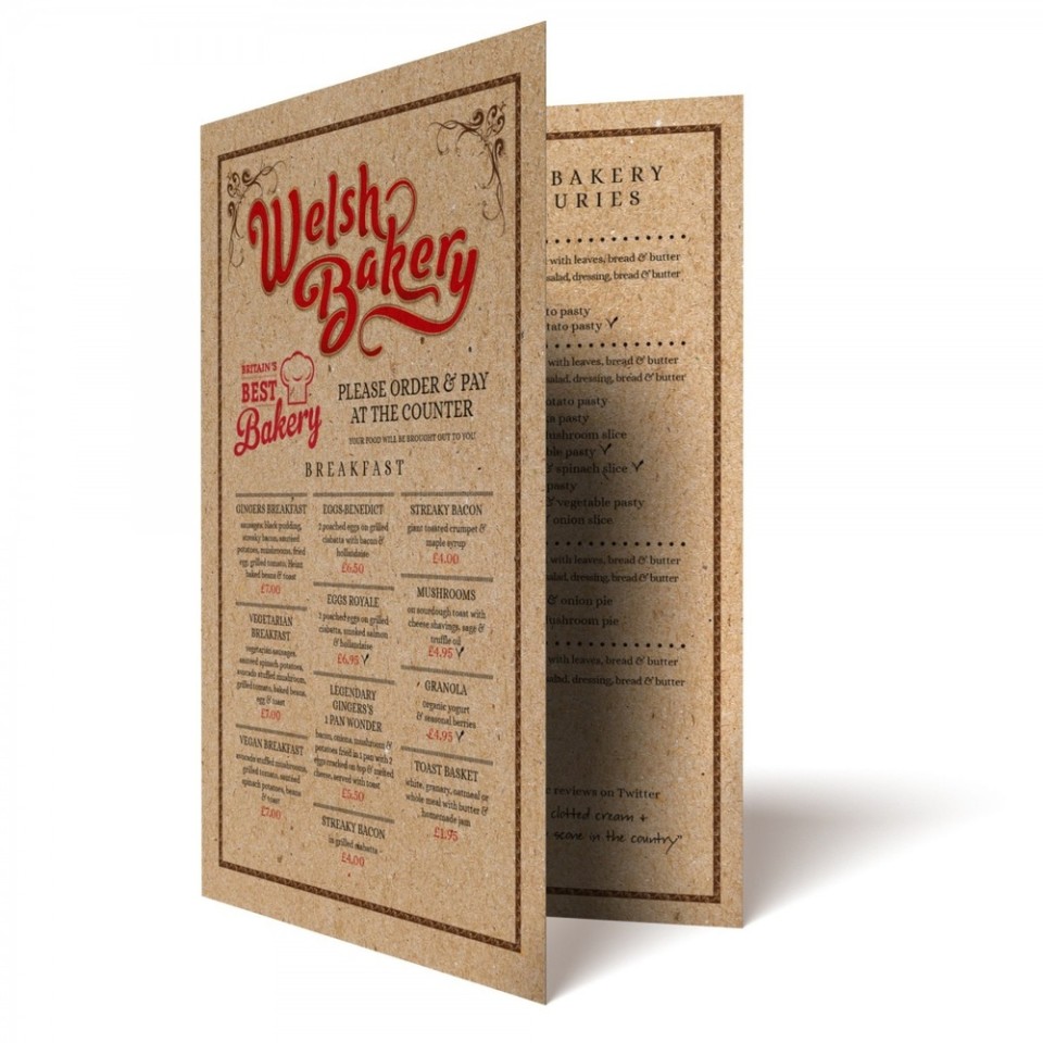 Please be aware that there are special considerations when designing brown Kraft menus. Due to its brown colouring, Kraft isn't generally suited to artwork featuring photographs or gradients. The stock tends to absorb printing inks, resulting in subtle, muted tones. With this in mind, we recommend keeping your design simple, using darker colours and avoiding very thin lines and small fonts. Your artwork will be printed in CMYK, so white areas of your design will effectively be transparent, revealing the light brown colour of the Kraft stock.
