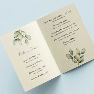 A wedding order of service can also be referred to as a ceremony programme or order of the day. They typically consist of a single sheet of printed card, a folded programme, or a stapled booklet and serve to inform guests of the day’s activities, as well as to share readings and hymns. They are often retained by those in attendance as a cherished memento of the occasion.