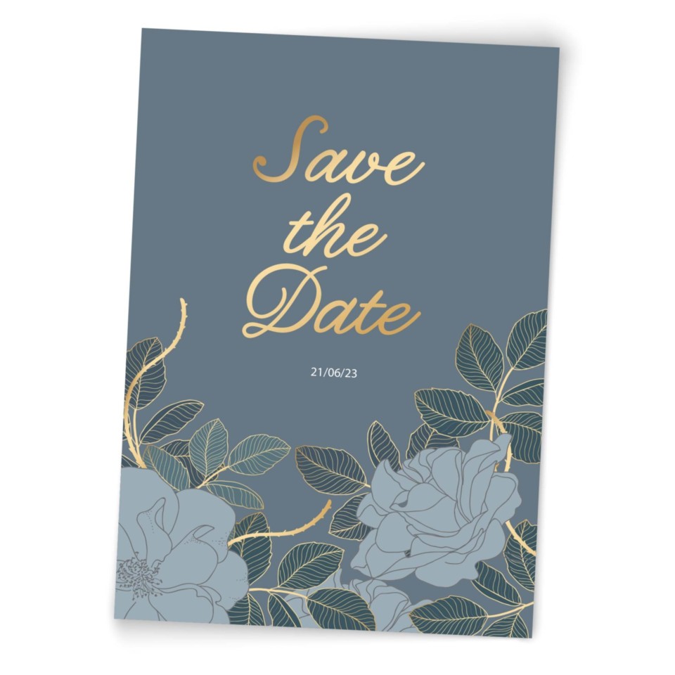 - Elegant save the date cards featuring metallic foil highlights