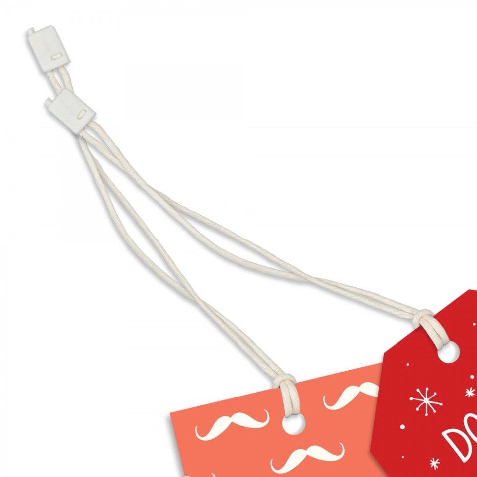 Add the finishing touch to your gifts with a unique gift tag, custom printed with your design. Ideal for use with corporate gifts, gift packaging and wedding favours, our tags can be supplied with either square-cut or parcel tag style angled corners, the choice is yours! Whichever shape you choose, your gift tags will be finished with a 4mm diameter hole top centre. They are supplied with 180mm white nylon string with a white snap lock. To assemble, simply insert the string through the hole and snap shut the lock.