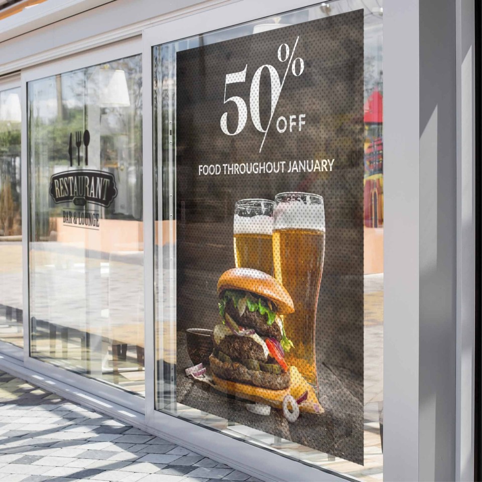 We can produce perforated window graphics in practically any shape or size, from an A3 sticker displaying a store's opening hours to a huge display covering every inch of a restaurant's floor-to-ceiling windows. Most one way vision window graphics are applied to the outside of the window (with the adhesive on the reverse of the printed graphic) but we can also supply reverse printed graphics (printed onto the adhesive side) so that the stickers can be applied to the inside of the window, providing extra protection from the elements. Either way, our perforated window stickers are a great way to attract the attention of passers-by or create privacy in the windows of beauty salons, surgeries and offices.